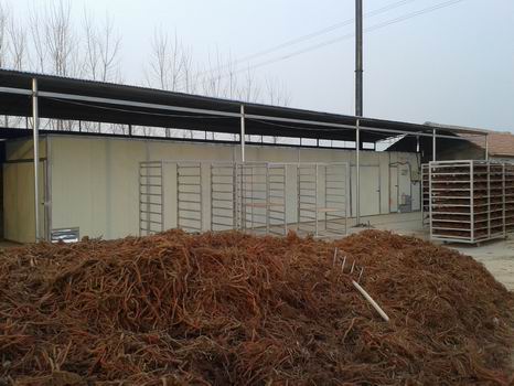 該干燥設(shè)備采用的是連續(xù)性烘干作業(yè),主要有干燥室、烘干車、料盤、供風(fēng)系統(tǒng)、熱風(fēng)爐、自動(dòng)電控系統(tǒng)等構(gòu)成。干燥室采用金屬保溫板或磚混結(jié)構(gòu),烘干盤采用金屬或其他材料制作。